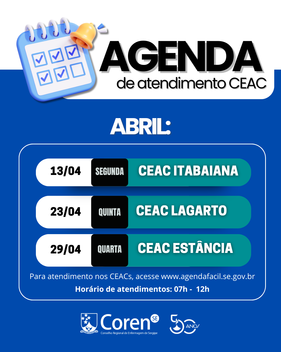 O Conselho Regional de Enfermagem de Sergipe (Coren-SE) divulgou o cronograma de atendimentos que serão realizados nos Centros de Atendimento ao Cidadão (CEACs) durante o mês de abril. A iniciativa tem como objetivo facilitar o acesso dos profissionais de enfermagem aos serviços do Conselho em diferentes regiões do estado.