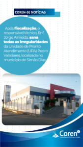 Após inspeções realizadas pela equipe de fiscalização do Conselho Regional de Enfermagem de Sergipe (Coren-SE), a Unidade de Pronto Atendimento (UPA) Pedro Valadares, localizada em Simão Dias, conseguiu sanar todas as irregularidades diagnosticadas pela enfermeira fiscal, Daniela Miranda.