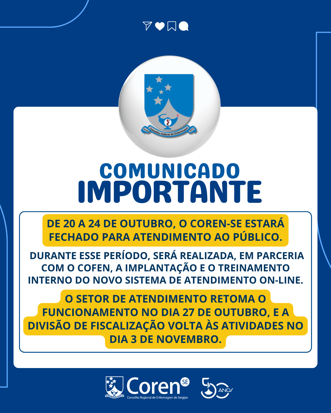 O Conselho Regional de Enfermagem de Sergipe (Coren-SE) informa que, no período de 20 a 24 de outubro, o atendimento ao público estará temporariamente suspenso. Durante esses dias, será realizada — em parceria com o Conselho Federal de Enfermagem (Cofen) — a implantação e o treinamento interno do novo Sistema de Atendimento On-line (SIGEN).
