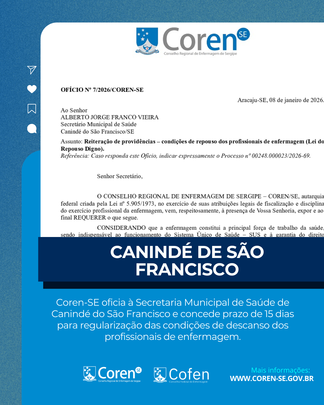 O Conselho Regional de Enfermagem de Sergipe (COREN-SE) reiterou, no início de janeiro, a solicitação de providências à Secretaria Municipal de Saúde de Canindé do São Francisco quanto às condições de repouso dos profissionais de enfermagem que atuam na rede municipal de saúde. A medida reforça a necessidade de cumprimento da Lei nº 14.602/2023, conhecida como Lei do Repouso Digno, que estabelece a obrigatoriedade de locais adequados para descanso durante a jornada de trabalho.