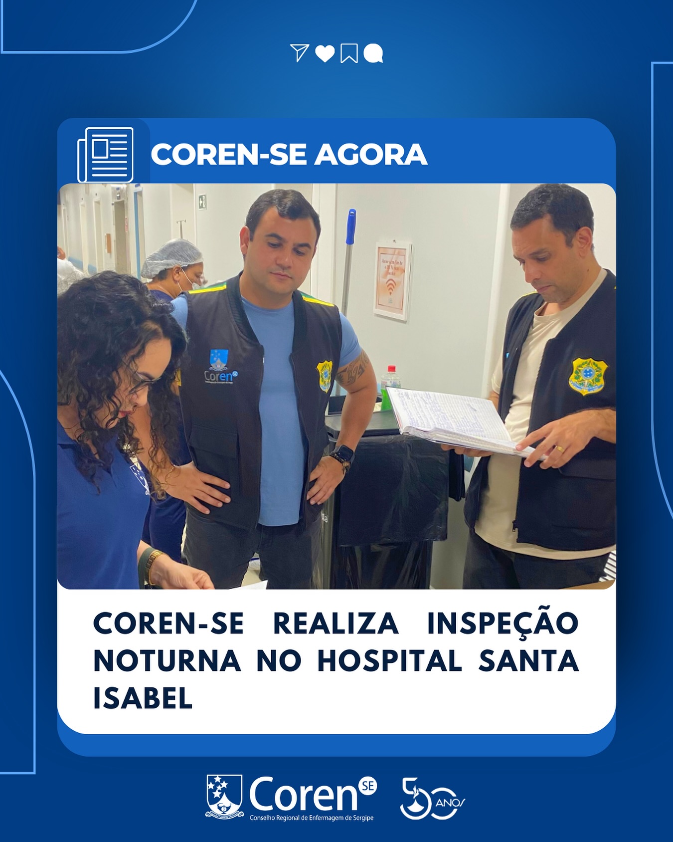Na noite de 16 de abril, o Conselho Regional de Enfermagem de Sergipe (Coren-SE) realizou uma importante inspeção no Hospital Santa Isabel. A ação, liderada pelo presidente do Coren-SE, Marcel Azevedo, e pelo conselheiro Igor Caio, acompanhados pela fiscal Patrícia Mendeiros e pelo assessor Felipe Fidelis, teve como objetivo principal garantir a conformidade das práticas de enfermagem com as normas e diretrizes estabelecidas. O foco é assegurar a segurança e a qualidade no atendimento aos pacientes, pilares fundamentais para a excelência dos serviços de saúde prestados à população sergipana.