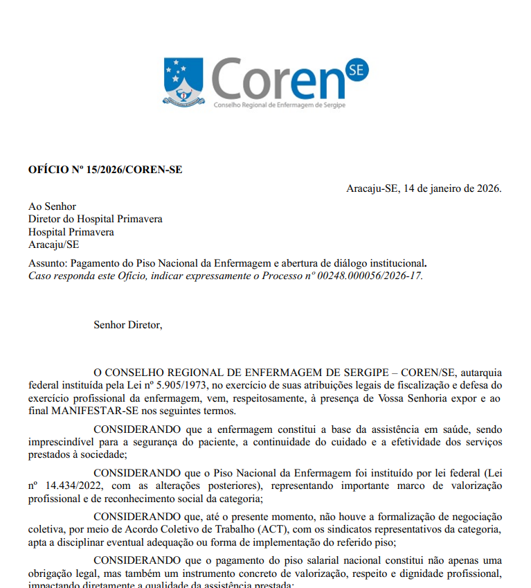 Reforçando sua postura institucional, o Coren-SE colocou-se formalmente à disposição para o diálogo com a diretoria do Hospital Primavera, em Aracaju, solicitando a realização de uma reunião para tratar especificamente da implementação do Piso Nacional da Enfermagem. A proposta é construir, de forma conjunta e transparente, soluções juridicamente seguras e socialmente justas, com a participação dos sindicatos representativos da categoria.