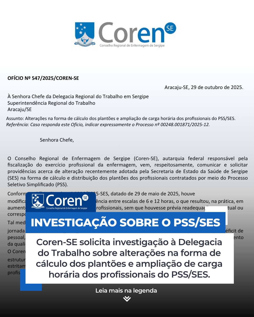 O Conselho Regional de Enfermagem de Sergipe (Coren-SE) protocolou, no dia 29 de outubro, o Ofício nº 547/2025, endereçado à Superintendência Regional do Trabalho em Sergipe, manifestando preocupação com as recentes modificações adotadas pela Secretaria de Estado da Saúde (SES) no cálculo e distribuição dos plantões dos profissionais contratados por meio do Processo Seletivo Simplificado (PSS). Segundo o documento, a medida — oficializada pelo Ofício Circular nº 3326/2025-SES — alterou a metodologia de equivalência entre escalas de 6 e 12 horas, gerando aumento da carga horária exigida sem que houvesse readequação contratual ou compensação remuneratória.