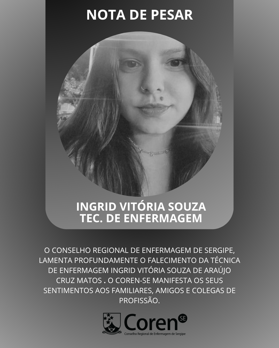 O Conselho Regional de Enfermagem de Sergipe, lamenta profundamente o falecimento da Técnica de enfermagem Ingrid Vitória Souza de Araújo Cruz Matos . O Coren-SE manifesta os seus sentimentos aos familiares, amigos e colegas de profissão.